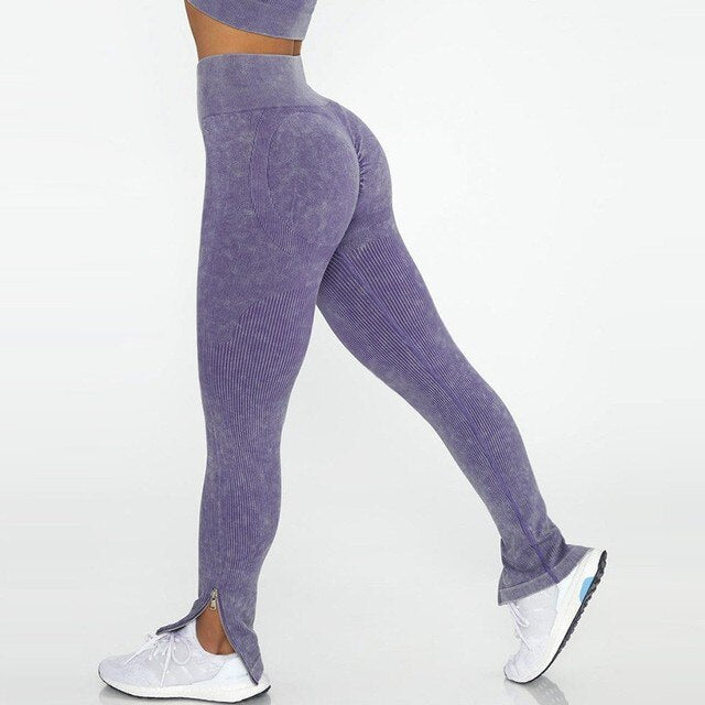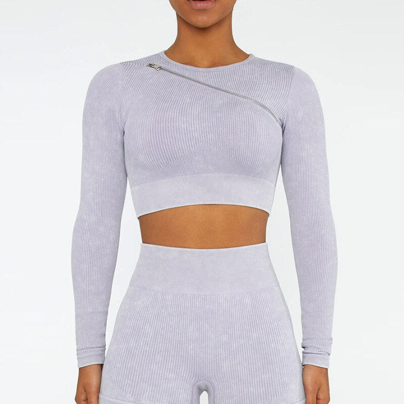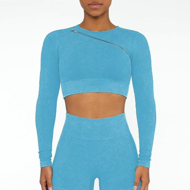 Seamless Gym Set Scrunch Butt Leggings Women Workout Clothing Sports Bra Crop Top Ribbed Long Sleeves Fitness Leggings Outfits